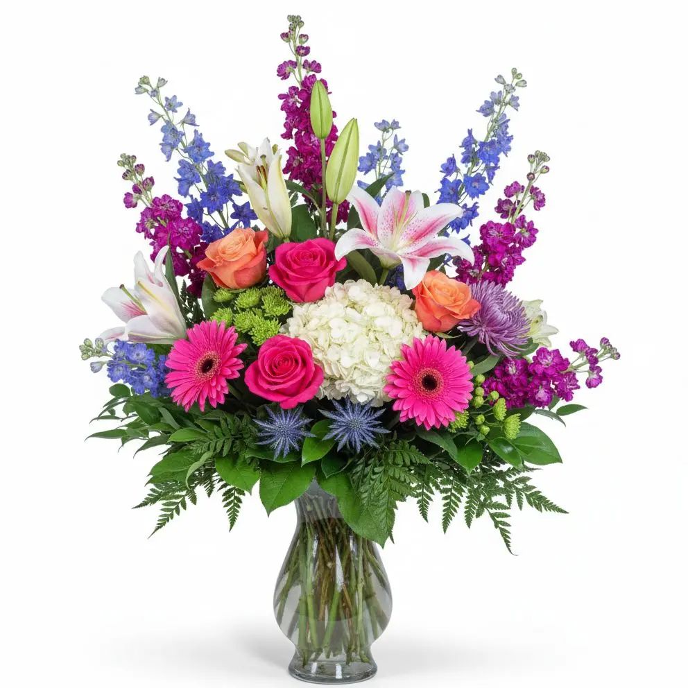 Experience a joyful burst of color with our Vibrant Harmony, a breathtaking arrangement designed to uplift spirits and brighten any space. Featuring an exquisite blend of hot pink and orange roses, majestic stargazer lilies, and vibrant purple and blue accents, it's a true celebration of nature's beauty. Send this stunning bouquet to convey your warmest wishes and create unforgettable moments.