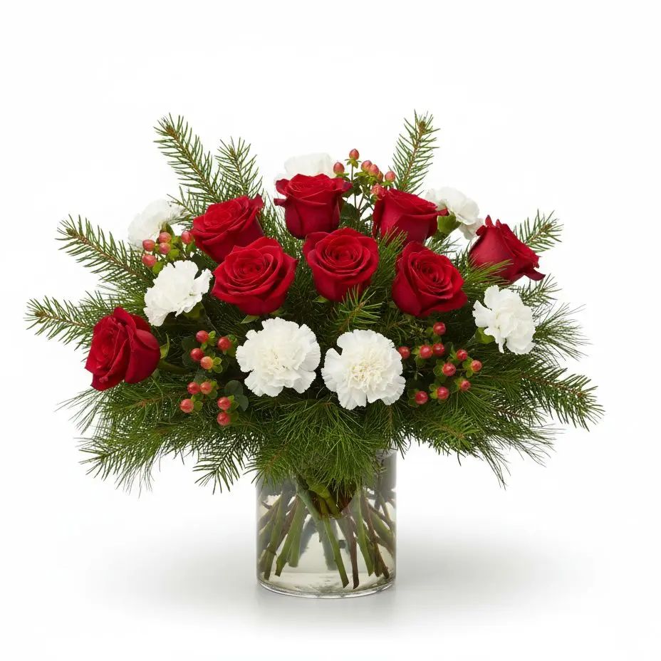 Celebrate love and warmth with our "Evergreen Embrace" bouquet, featuring twelve radiant roses beautifully complemented by cheerful carnations and vibrant hypericum berries. Lush evergreen accents add a touch of timeless elegance and natural charm. This exquisite arrangement is perfect for expressing heartfelt emotions and brightening any day.